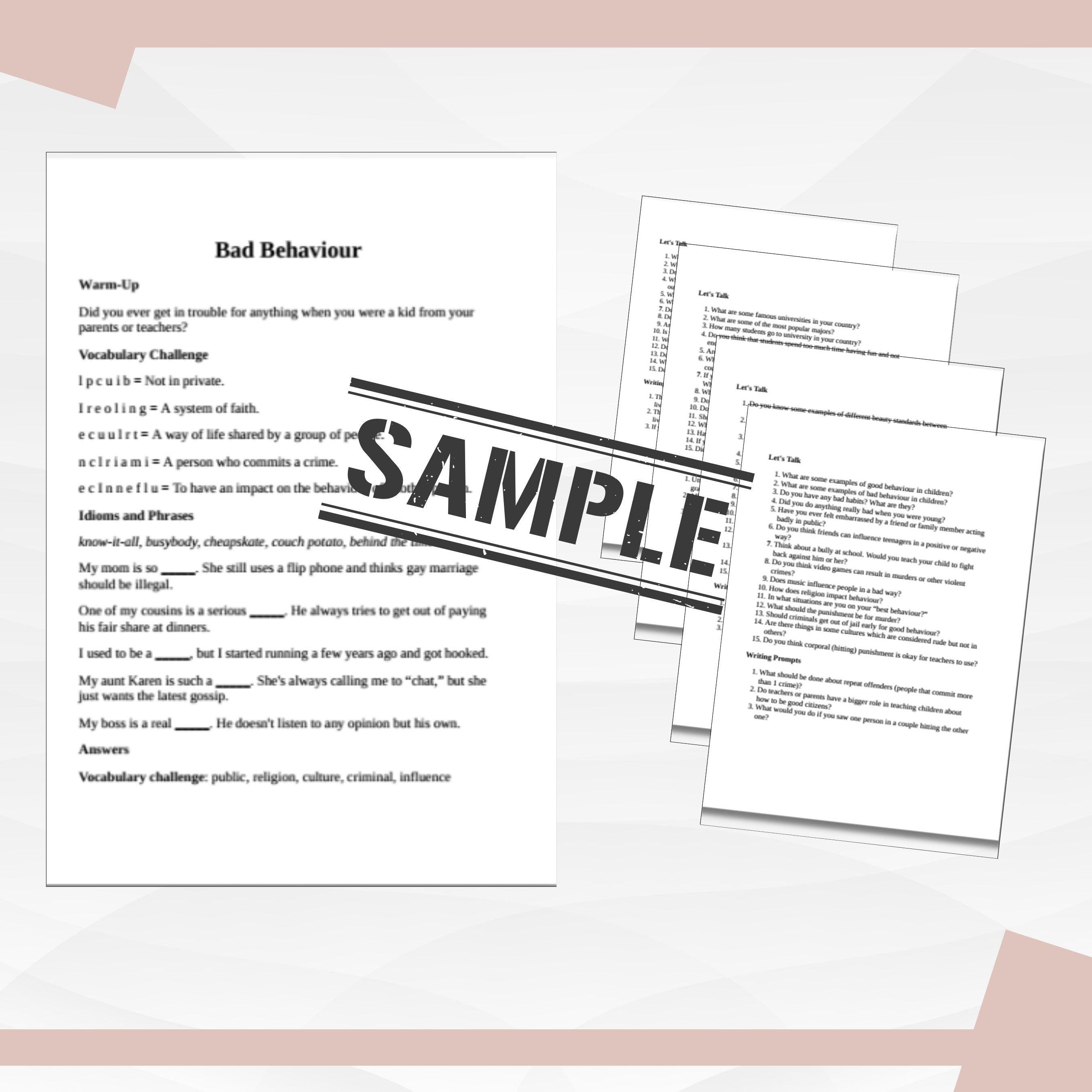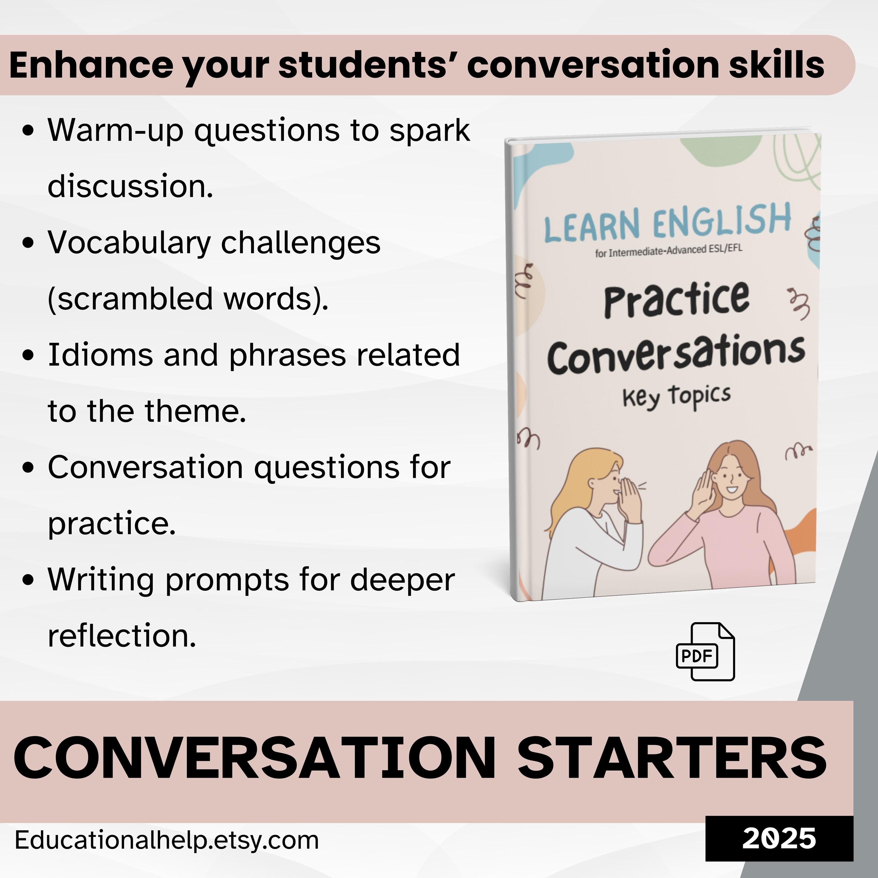This PDF is a comprehensive English conversation practice guide designed for intermediate to advanced ESL/EFL learners. It covers 49 diverse topics, each structured with warm-up questions, vocabulary challenges, idioms, conversation questions, and writing prompts. The book is ideal for classroom use, private tutoring, or self-study, aiming to enhance speaking, writing, and vocabulary skills through engaging discussions on real-world subjects like advertising, health, technology, and more.