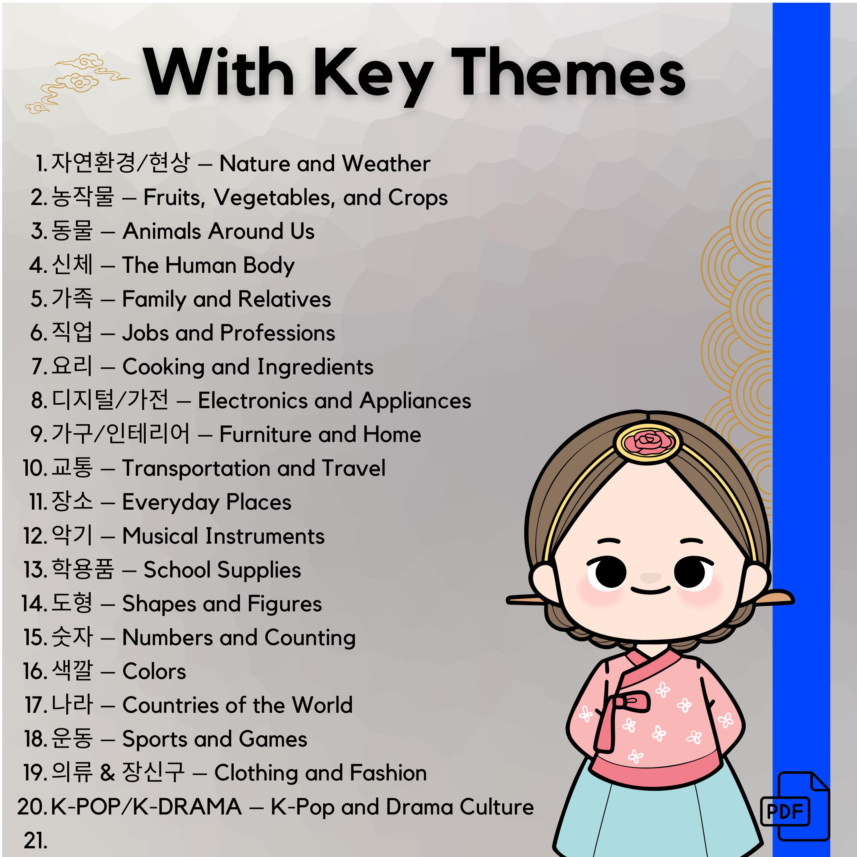 Master everyday Korean vocabulary with our printable flashcard set! This resource includes 720 essential Korean words carefully organised into 20 practical themes such as nature, family, jobs, food, transportation, and more. Each flashcard features clear Korean terms accompanied by their English meanings, making it simple and effective for learners of all levels. Whether you are studying for exams, teaching Korean, or practising daily conversation, these flashcards will help you build a strong foundation in Korean vocabulary. Print, cut, and study at your own pace to make memorisation easy and engaging.